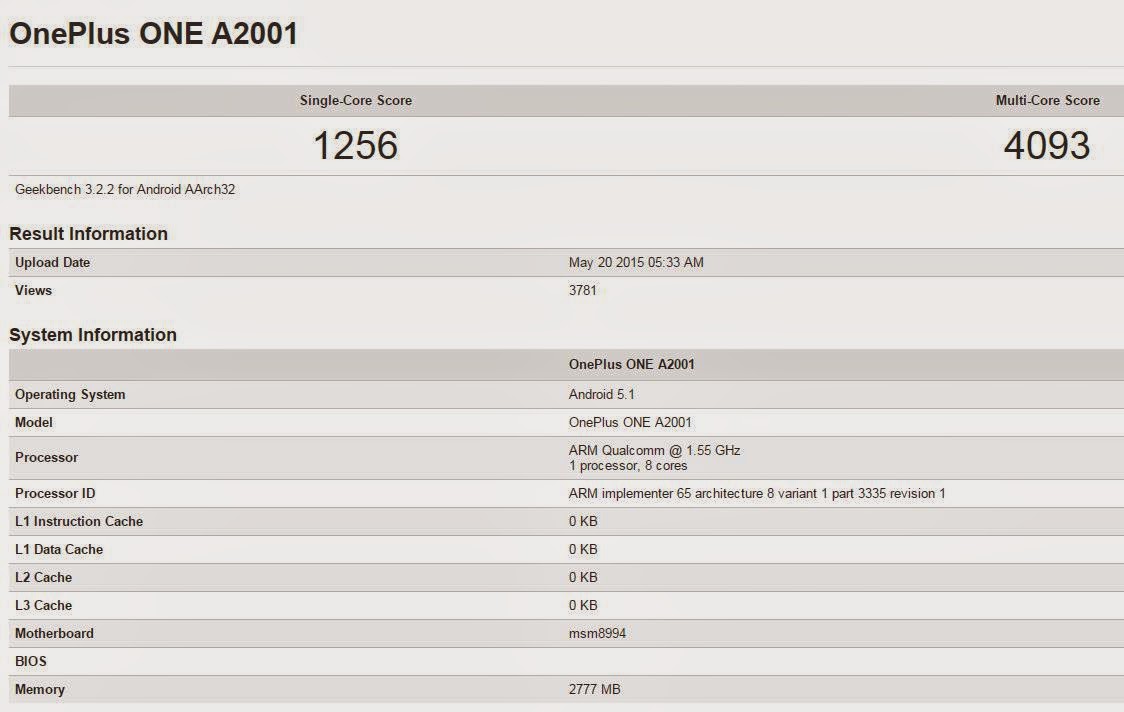 The Geekbench Benchmark test for a device named OnePlus One A2001 was spotted on the site which further revealed that the device also includes a 2777MB RAM which implies that it will come with a 3GB RAM. It will also be powered by a 64-bit 1.55GHz octa-core chipset. The rumoured OnePlus Two has also received a score of 1256 for single-core and 4093 for multi-core.