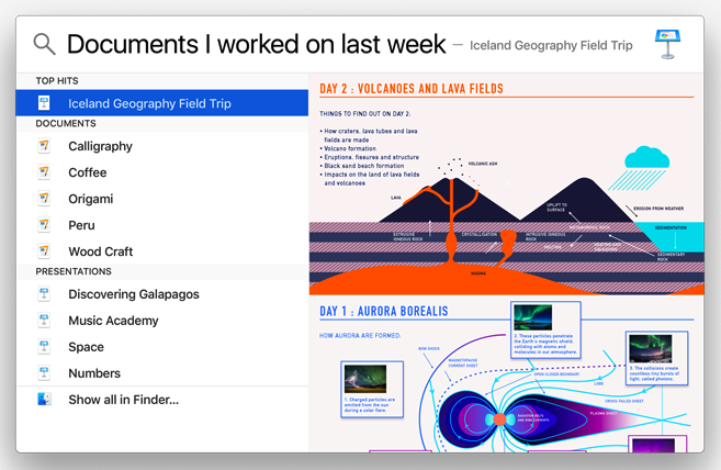 Spotlight Search will have the ability to use Siri for natural language search terms. For instance a query such as ‘Help me find documents I was working on yesterday’, will pull up a list of documents you were working on yesterday. In a similar manner the Spotlight app can also look up weather, stocks and games.